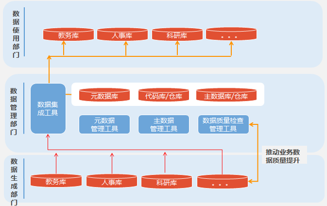 数据生产部门:学校办公室、人事处、财务处、教务处、科研处、后勤处、基建处、校园发展办、学生工作处、保卫处、网络与教育技术中心等。
