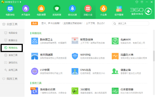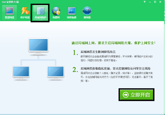 在“网络优化”栏目里打开“流量防火墙”,点击“局域网防护”,然后点击“立即开启”: