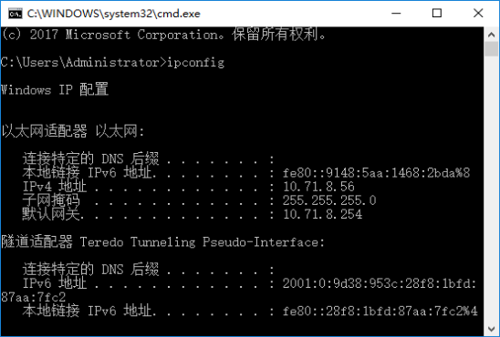 打开命令提示符(通过组合键[Windows键+R键]打开“运行”窗口,输入cmd,确定),输入ipconfig,