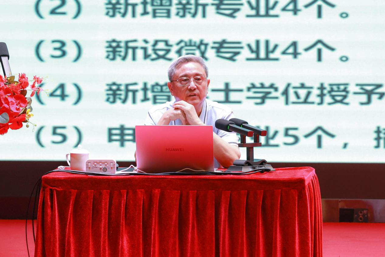 大会第二阶段为学校期末工作总结会议。首先,人工智能与数字经济产业学院院长贺敏伟作了以教学改革为主题的典型交流发言,分享了学院在强化校企合作、深化产教融合方面的思路、做法与成效。随后,胡社军校长在会上对本学期工作进行了全面回顾与总结,并对下学期及暑期工作进行了详细部署。校长指出,本学期学校在教育教学、科研创新、师资队伍建设等方面取得了显著成效,特别是在合格评估准备、学科专业建设及校企合作方面取得了突破性进展。面对高等教育的新机遇,学校将扎实推进本科教学工作合格评估和硕士学位授予立项建设单位相关工作。同时,积极响应教育强国战略,精准优化专业设置,持续深化教育教学改革,全面提升学校整体办学水平。校长强调,全校教职工要积极行动起来,以高度的责任感和使命感,共同推动学校高质量发展,为出色完成各项任务而努力奋斗。